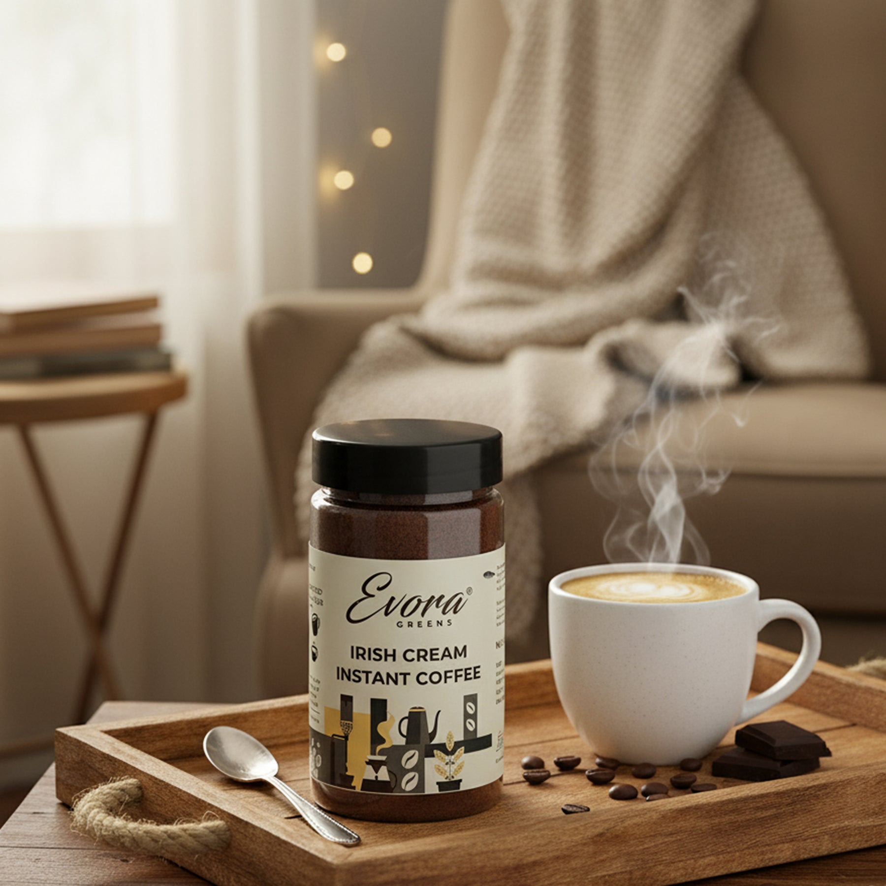 Experience the captivating taste of Evora Greens Irish Cream Instant Coffee. An enchanting fusion of gourmet coffee and creamy Irish charm. Pure indulgence in every cup.