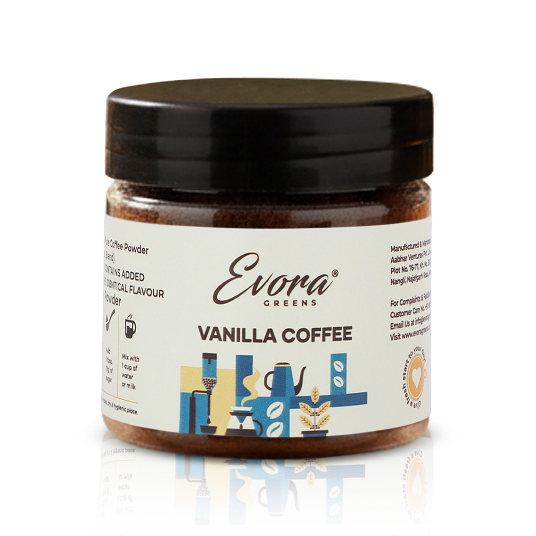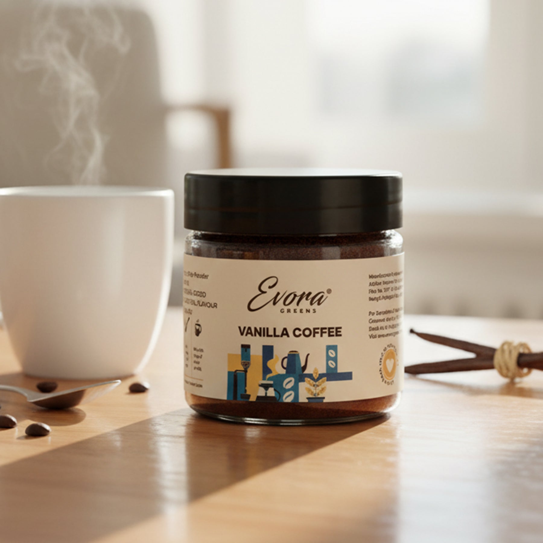 Indulge in the velvety goodness of Evora Greens Vanilla Instant Coffee. A rich fusion of gourmet coffee and luscious vanilla flavour. Pure bliss in a cup.